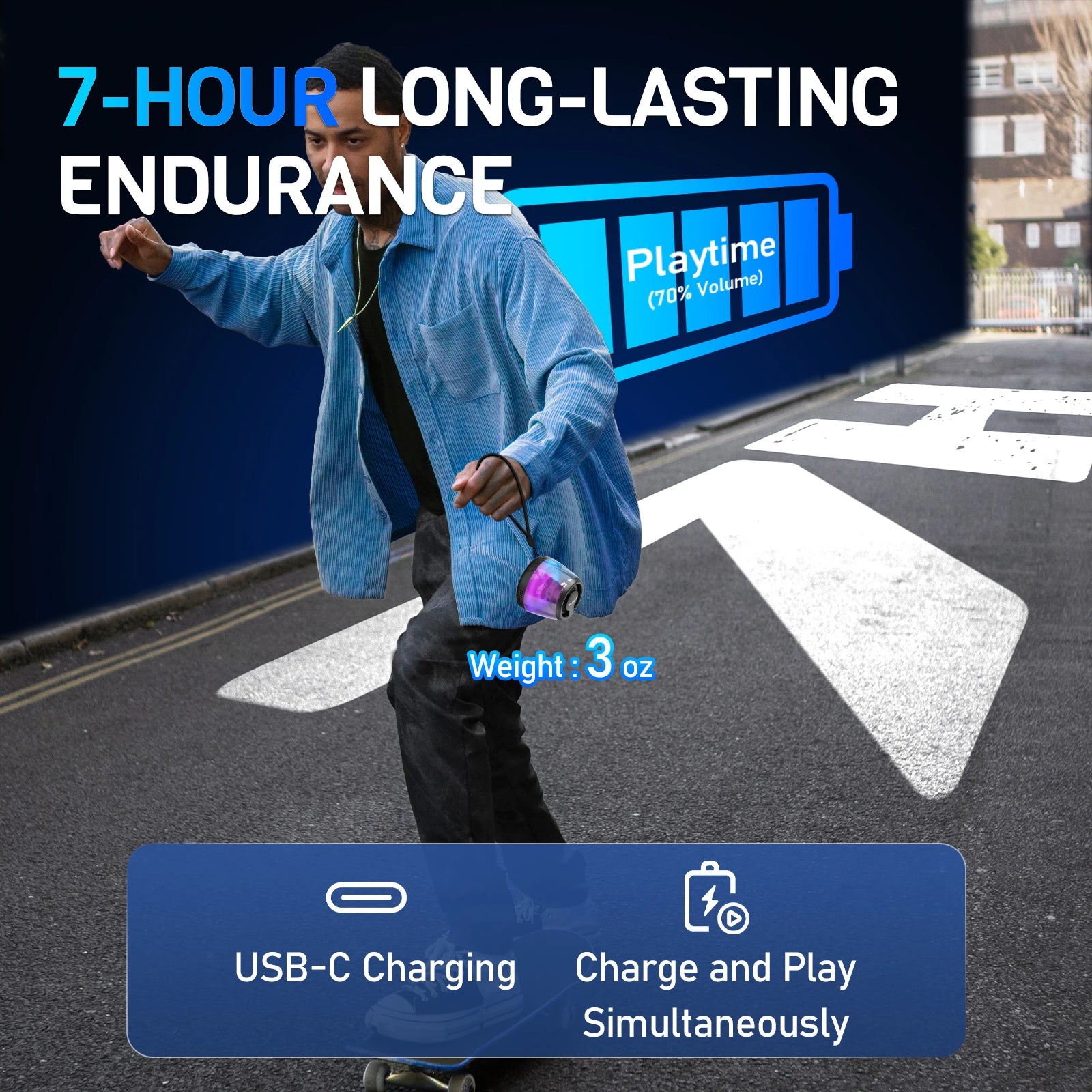 【Impressive Battery Life】Powered by a high-capacity rechargeable battery, this bluetooth speaker magnetic offers up to 7 hours of playtime at 70% volume, so you can enjoy outdoor activities without battery anxiety. If you're watching videos indoors, it supports use while charging, ensuring uninterrupted enjoyment.