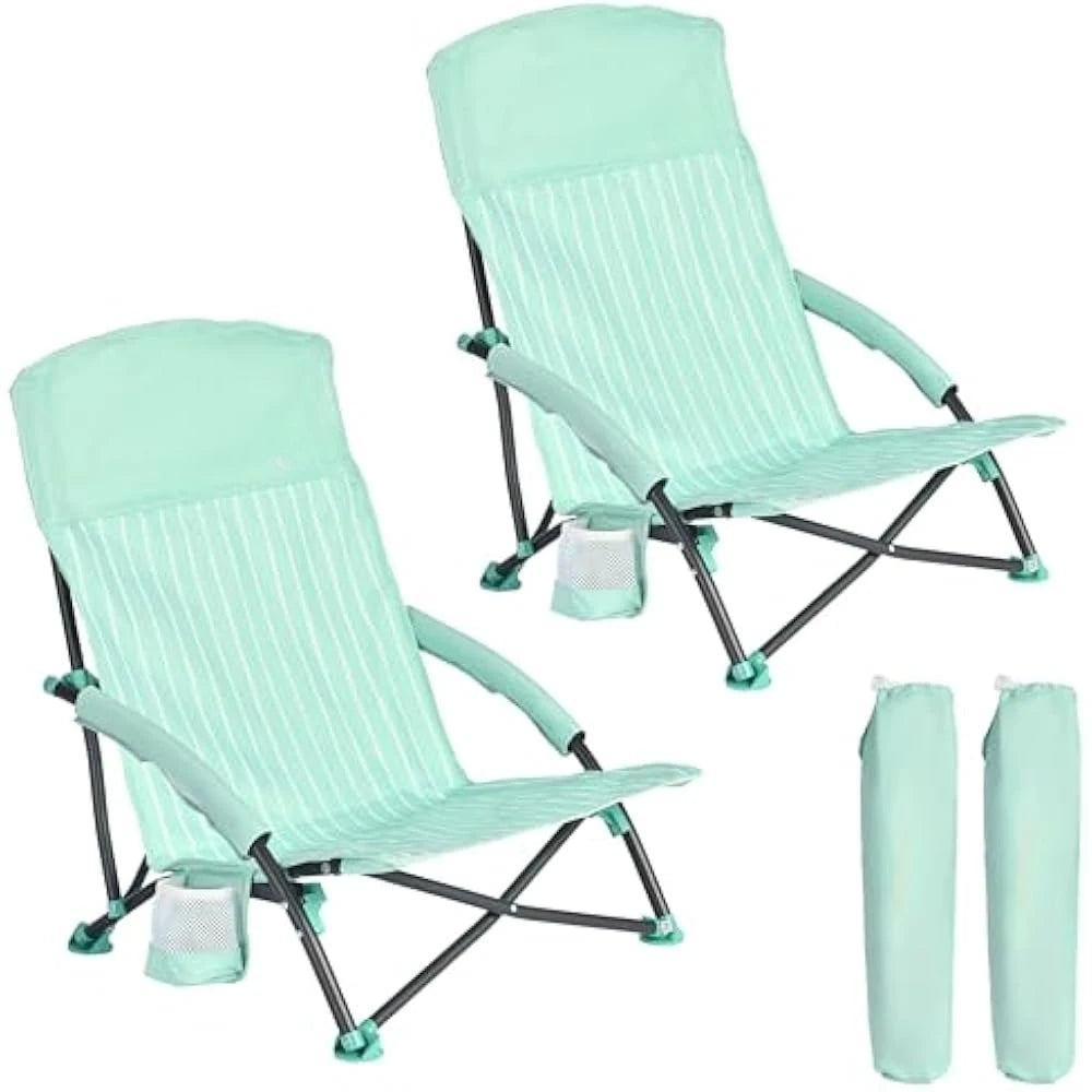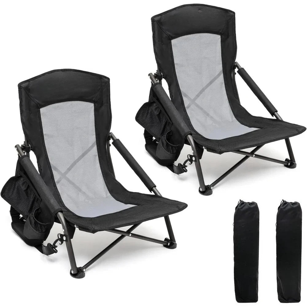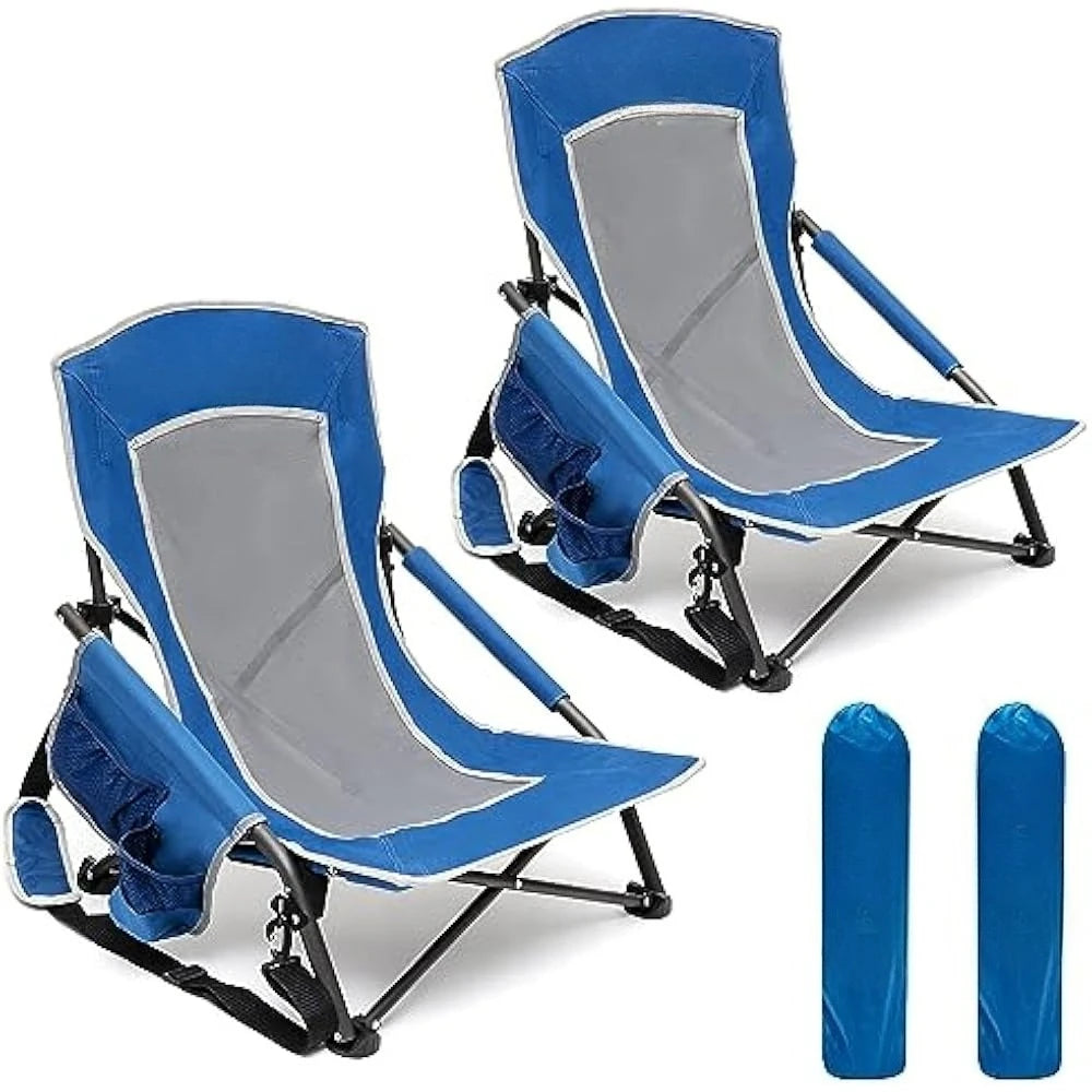 Folding Low Camping Beach Chair 2 Pack, Lightweight Portable Lawn Chair with Mesh Back, Cup Holder for Outdoor/Travel/Picnic