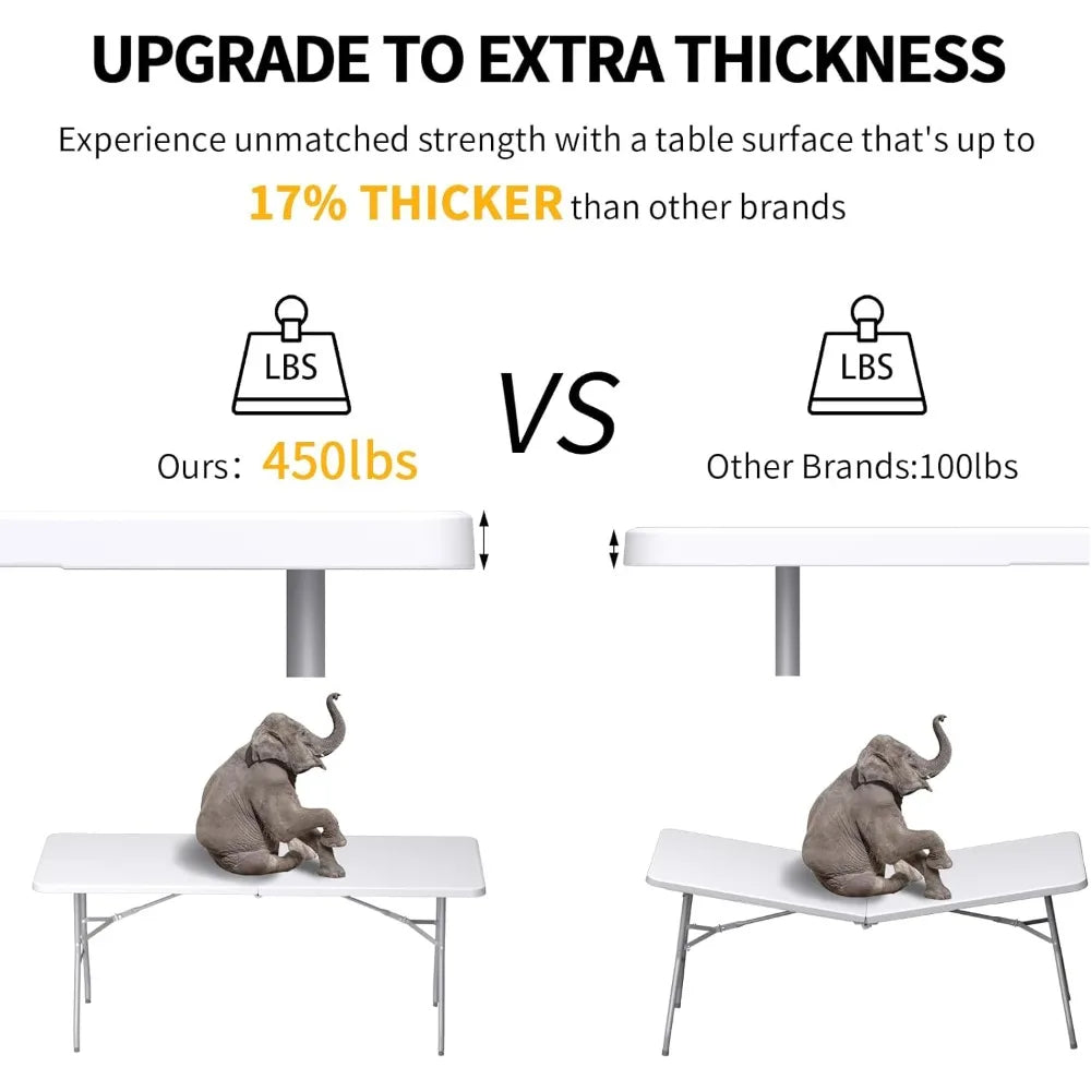 - 【Unprecedented Durability and Stability】Our folding table 6ft uses thickened HDPE panels that are 17% thicker than other brands for unmatched durability. With a sturdy 450-pound weight capacity-three times that of others-it is perfect for any gathering. Equipped with support rods and locking mechanisms for safety, and non-slip pads to protect your floors, this camping table ensures stability. Thick steel legs resist rust and corrosion, making it a reliable choice for indoor and outdoor use.