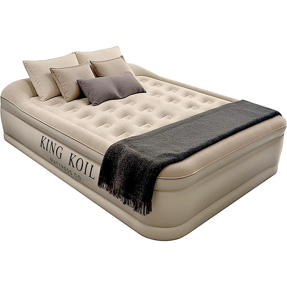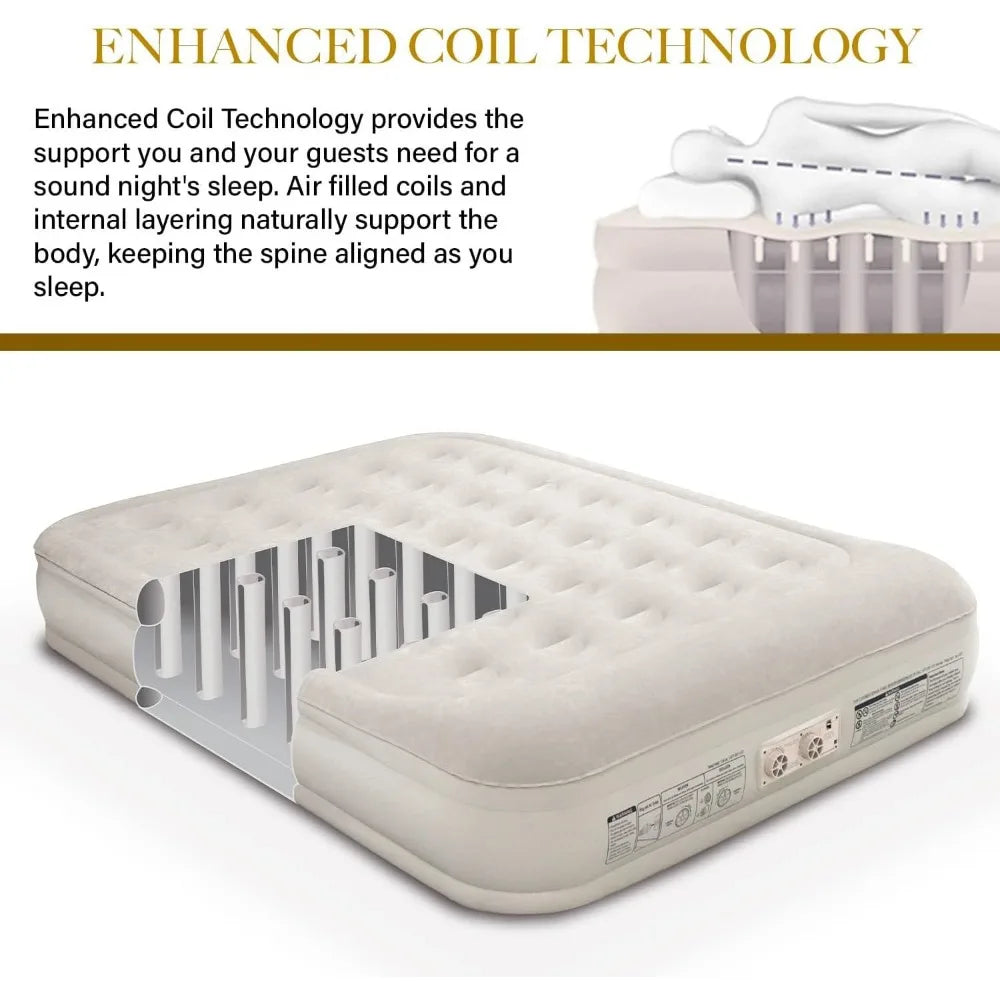 Elevate your sleep experience with our queen-sized airbed, engineered for unrivaled support through an innovative coil-beam design, plush pillow top, and velvety soft flocking layer. Constructed with waterproof, puncture-resistant, and ultra-durable materials, this air mattress delivers hotel-quality rest night after night. Indulge in the ultimate combination of superior craftsmanship, luxurious comfort, and lasting durability, because you deserve the best