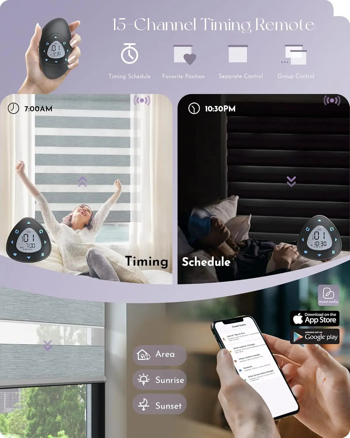 - 15-channel timing remote: Able to seperately & group control maximum 15 smart curtains. It provides favorite position as well (the basic program of remote will be set before shipment). 20 date-time groups available, add any electric curtains to any schedules to achieve automatic timing control as preference. Support handheld or wall-mounted.