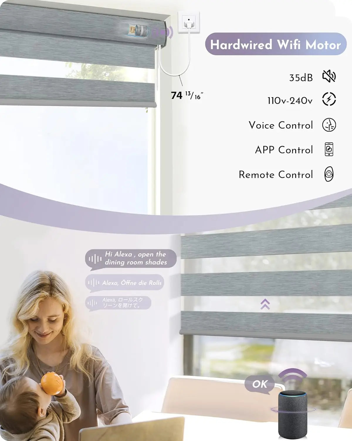 - Direct to alexa/google: Hardwired motor and always plugged in, work with 2.4g/5ghz wifi. Easily achieve app control & voice control, no smart bridge required. Flexibly create groups or routines, set timing schedules and percentage control your smart blinds via mobile app or voice command, really free your hands! What's more, graywind automatic shades also can be controlled on app even you're away from home, no further worries.