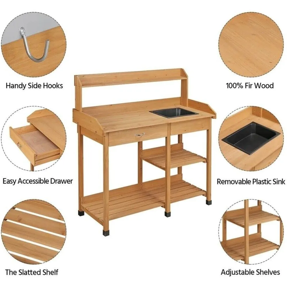 - Multipurpose Potting Bench: Our garden table serves a practical purpose in your backyard, patio, lawn, or garden. The work bench is not only used for storing tools or planters, but also for washing hands in the top sink after completing gardening work.