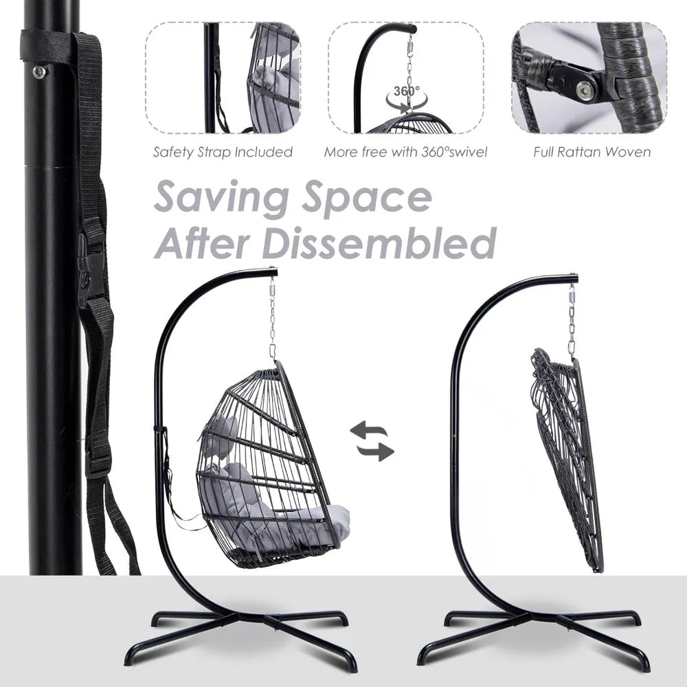 - EASY TO ASSEMBLE DISASSEMBLE: This one-person chair can be folded and the stand frame is simple to fix together with the included tools and accessories; Everything you need is in one box, including the basket, headrest pillow, seat cushion, safety strap, and stand; Safety strap helps keep the chair safely in place while getting in and out of the chair